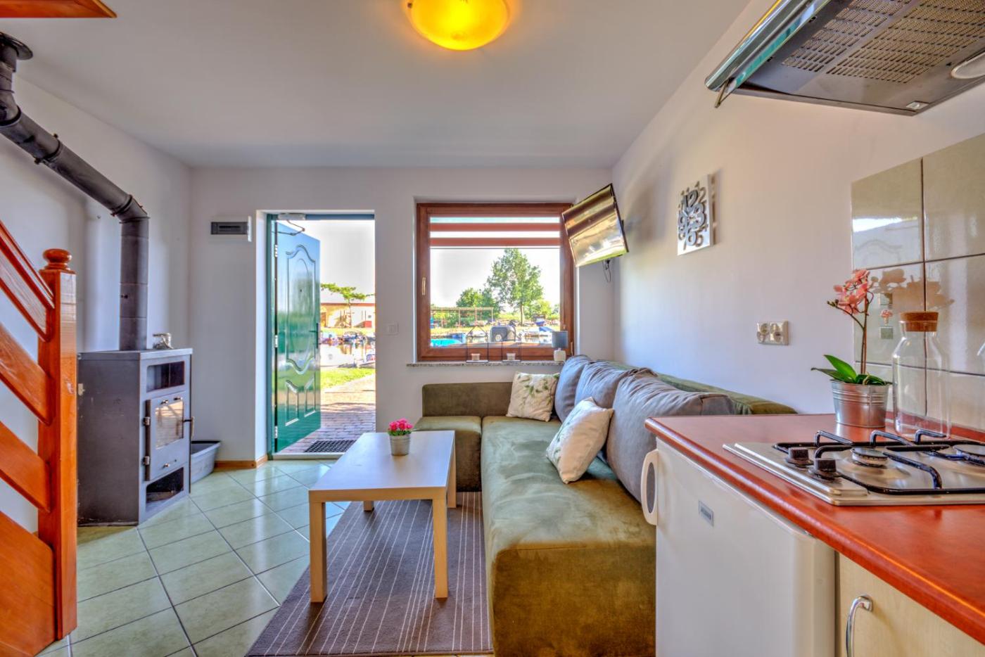 Apartament. The fireplace is a top feature of this apartment. Boasting a private entrance, this apartment comes with 1 living room, 1 separate bedroom and 1 bathroom with a walk-in shower and a hairdryer. Guests will find a stovetop, a refrigerator, kitchenware and a toaster in the kitchenette. The apartment also includes a barbecue. Featuring a terrace with lake views, this apartment also features a tea and coffee maker and a flat-screen TV. The unit has 5 beds. Apartament - 4 osobowy. Powierzchnia pokoju ok.: 40 mkw. ;