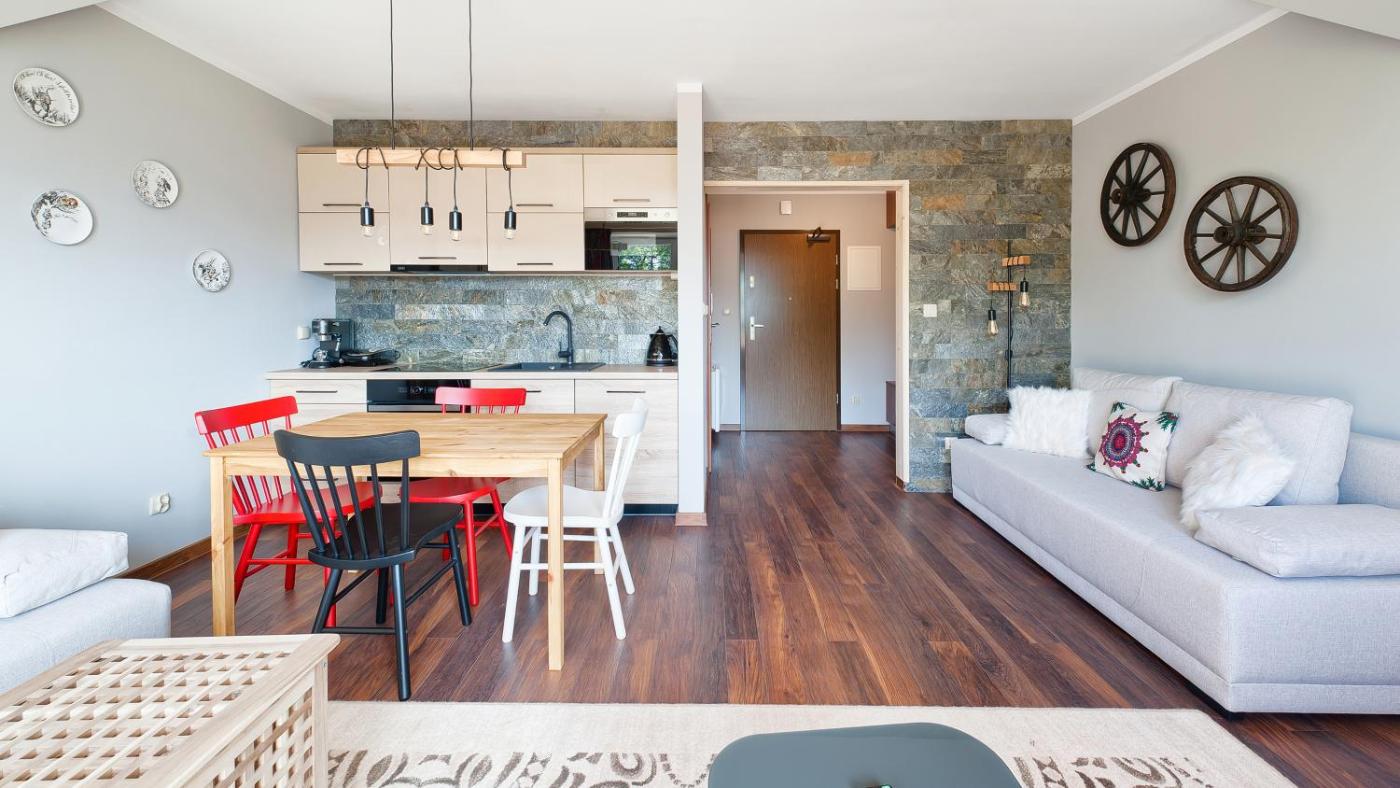 Studio. Guests will have a special experience as the studio features a fireplace. The fully equipped kitchenette features a stovetop, a refrigerator, kitchenware and an oven. The studio provides a coffee machine, a dining area, a balcony with mountain views as well as a private bathroom featuring a shower. The unit offers 2 beds. Studio - 4 osobowy. Powierzchnia pokoju ok.: 30 mkw.